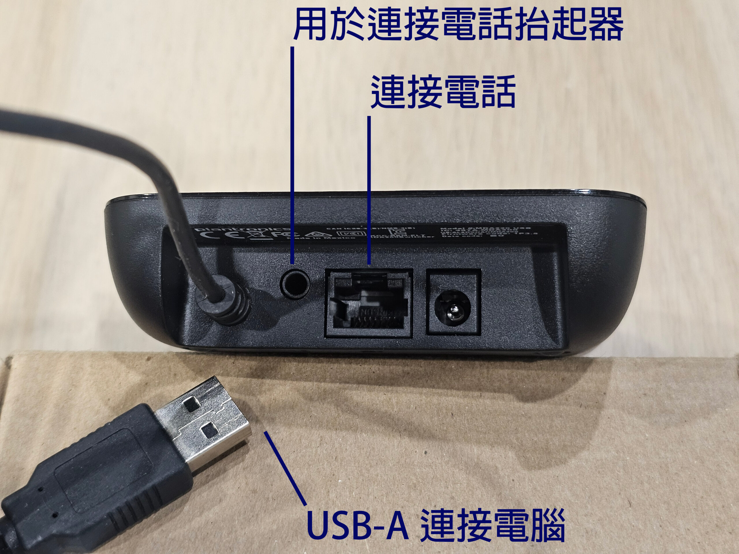 Plantronics MDA220搭配BTD800 USB藍牙接收器,可將MDA220自帶的USB-A接頭插上電腦,並將配件的RJ45-RJ9轉接線連接MDA220與話機。